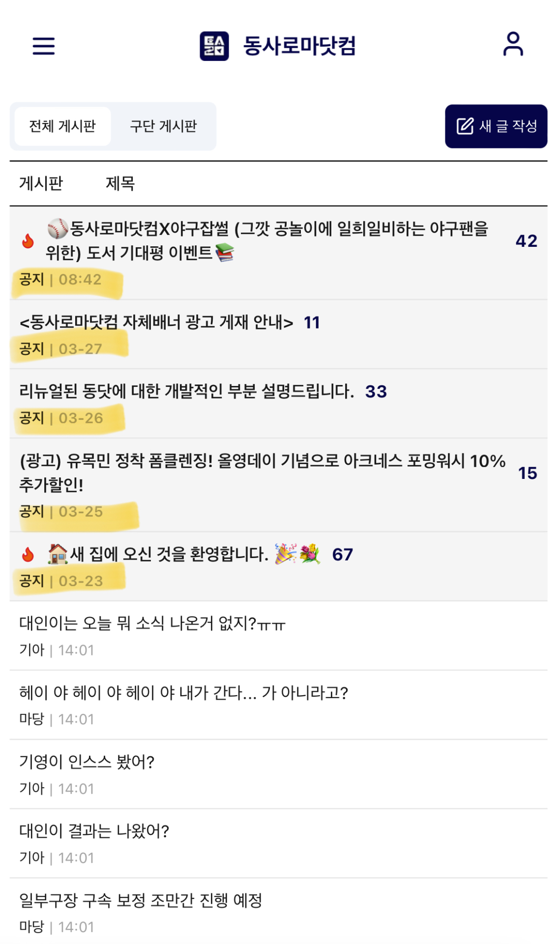 게시글 작성 버튼 영역이 한 줄 통으로 묶여있는데 버튼 눌러야 게시글 작성 화면으로 넘어가게 바꾸면 어떨까요? (0)