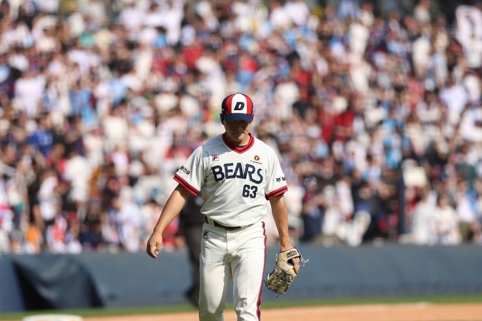 두산 신인 투수 김택연이 지난 19일 잠실 롯데전에서 투구를 마친 후 더그아웃으로 돌아가고 있다. 사진 | 두산 베어스