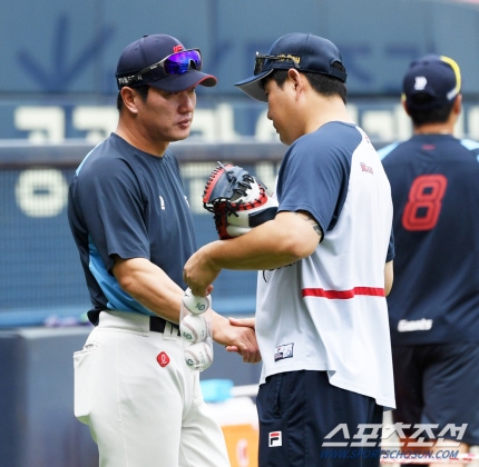 윤동희 사인볼을 챙긴 양의지에게 다가온 김주찬 코치는 뱃살을 꼬집으며 반갑게 인사를 했다