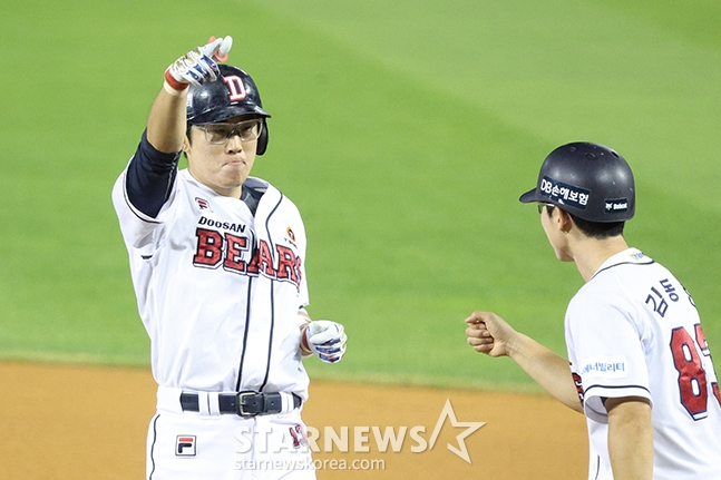 안타를 날리고 기뻐하는 허경민(왼쪽). /사진=김진경 대기자