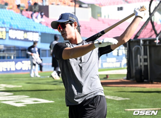 [OSEN=잠실, 이대선 기자] 2일 오후 서울 잠실야구장에서 2024 신한 SOL뱅크 KBO 포스트시즌 와일드카드 결정 1차전 두산 베어스와 KT 위즈의 경기가 열렸다.두산은 곽빈, KT는 윌리엄 쿠에바스를 선발 투수로 내세웠다.경기에 앞서 두산 김재호가 타격 훈련을 하고 있다. 2024.10.02 /sunday@osen.co.kr